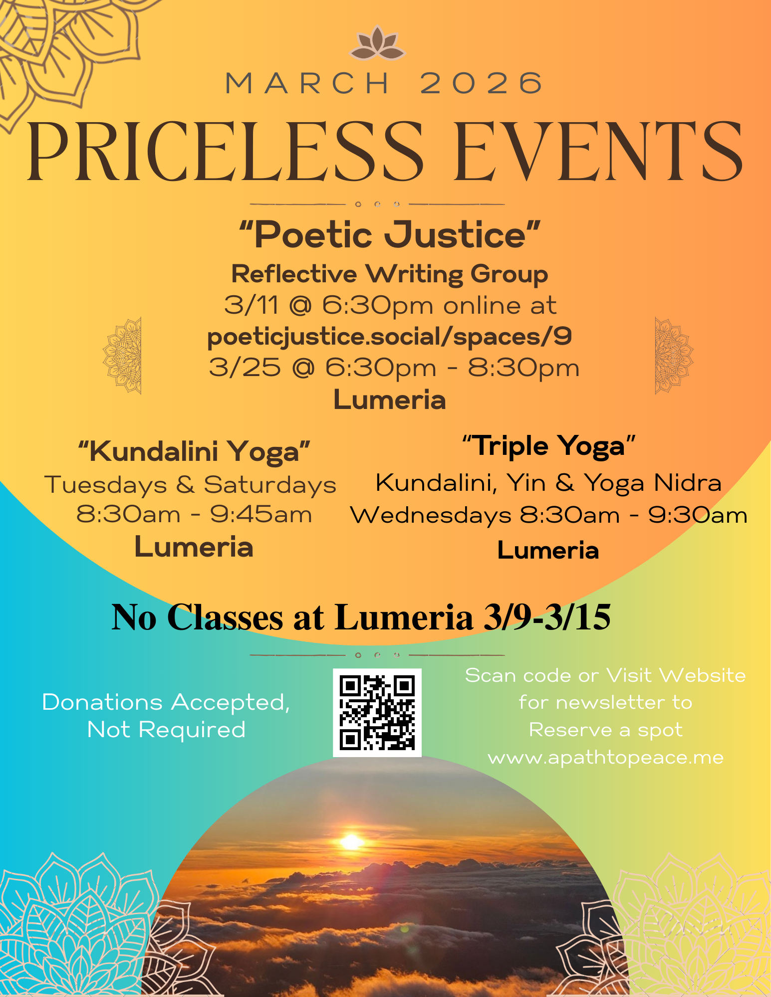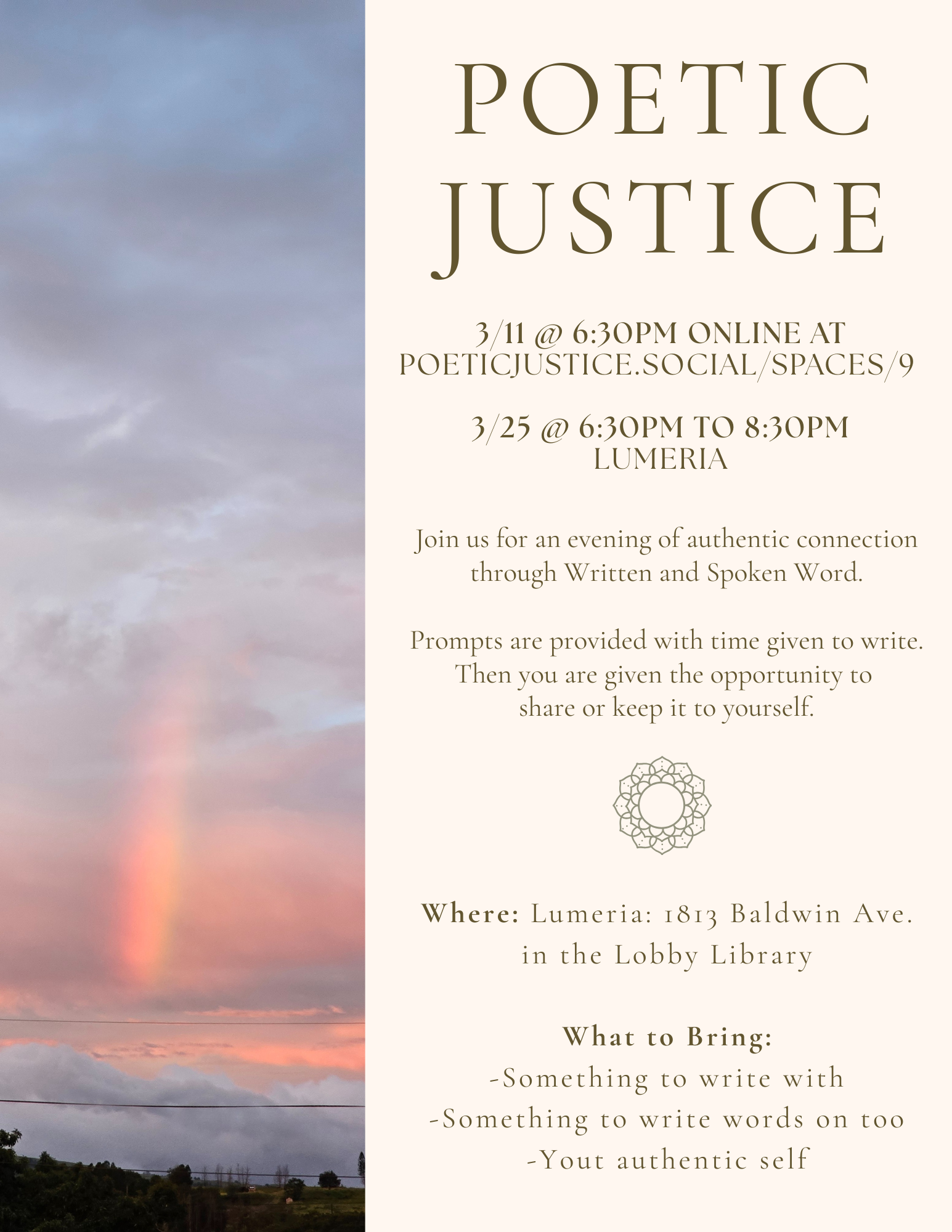 Poetic Justice - Community gathering with writing prompts, time to write & time to share with each other. A beautiful time to inflect, express & reflect!
